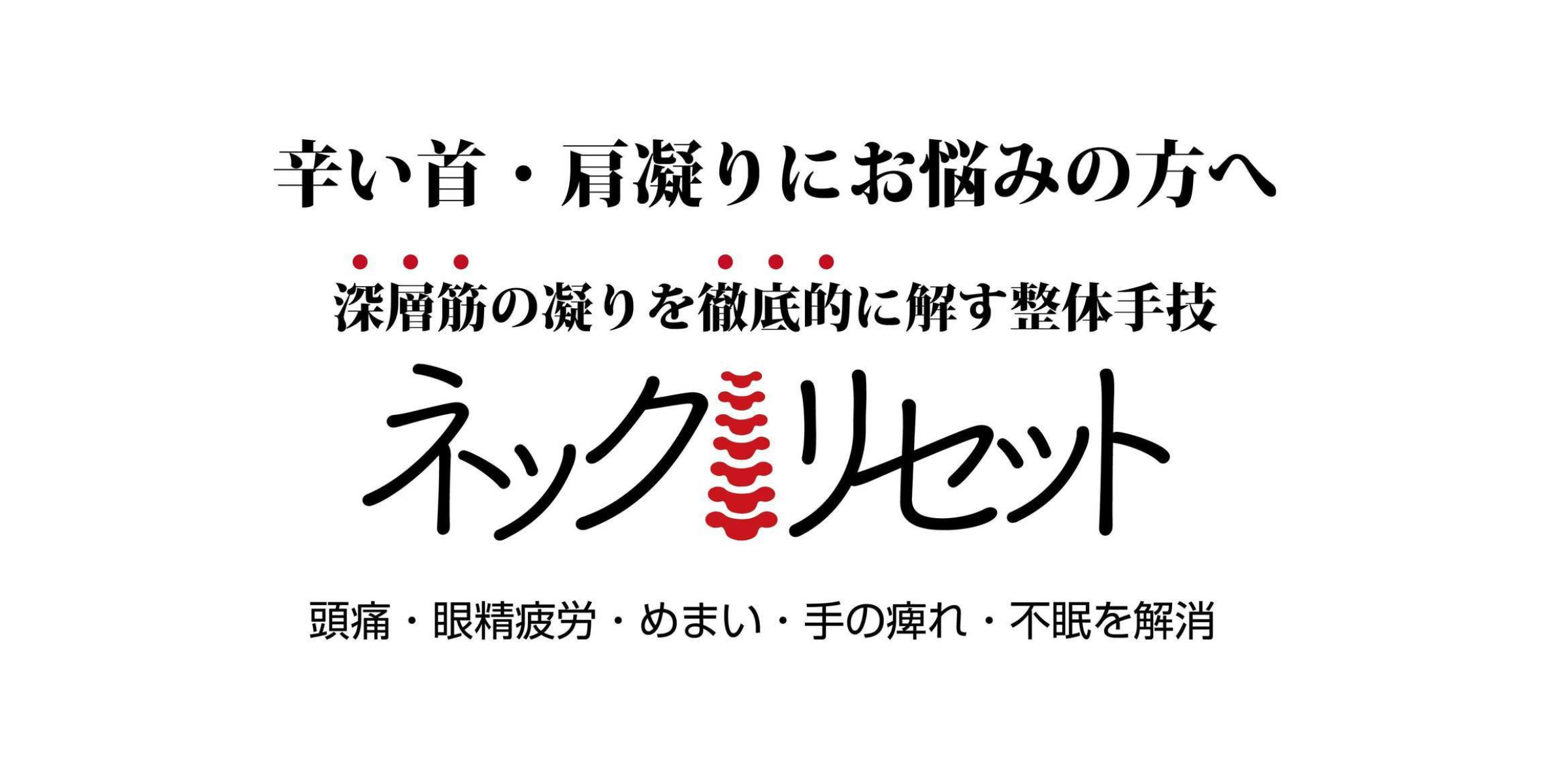 当院オリジナル施術「ネックリセット」は首凝りに特化し症状改善が見込める整体手技で凝り取り&血流改善を行います。さらに首肩・腰痛・膝痛などの痛みや症状を繰り返さない「運動療法施術」で歪み矯正&姿勢改善を行います。